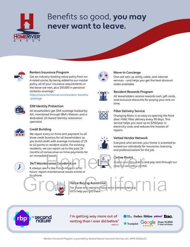 All HomeRiver Group residents are enrolled in the Resident Benefits Package (RBP) for $49.95/month. This includes renters insurance, a move-in concierge service to make setting up your utilities and home services easier, $1M identity protection, a top-tier resident rewards program, credit building with on-time rent payments, and HVAC air filter delivery (where applicable). More details are available upon application.